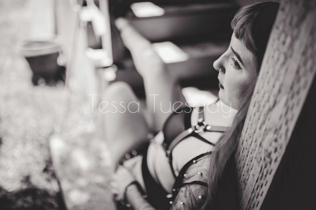 You step outside of a kinky play party your friend invited you to and you run into one of the sexiest people you've ever met just relaxing in the sunlight. She asks you if you could take some photos of her since she loves this outfit but there's no photos allowed inside. You get some good shots in and she's really impressed with them. Then asks you, while on her knees, if you want to go back inside and play.