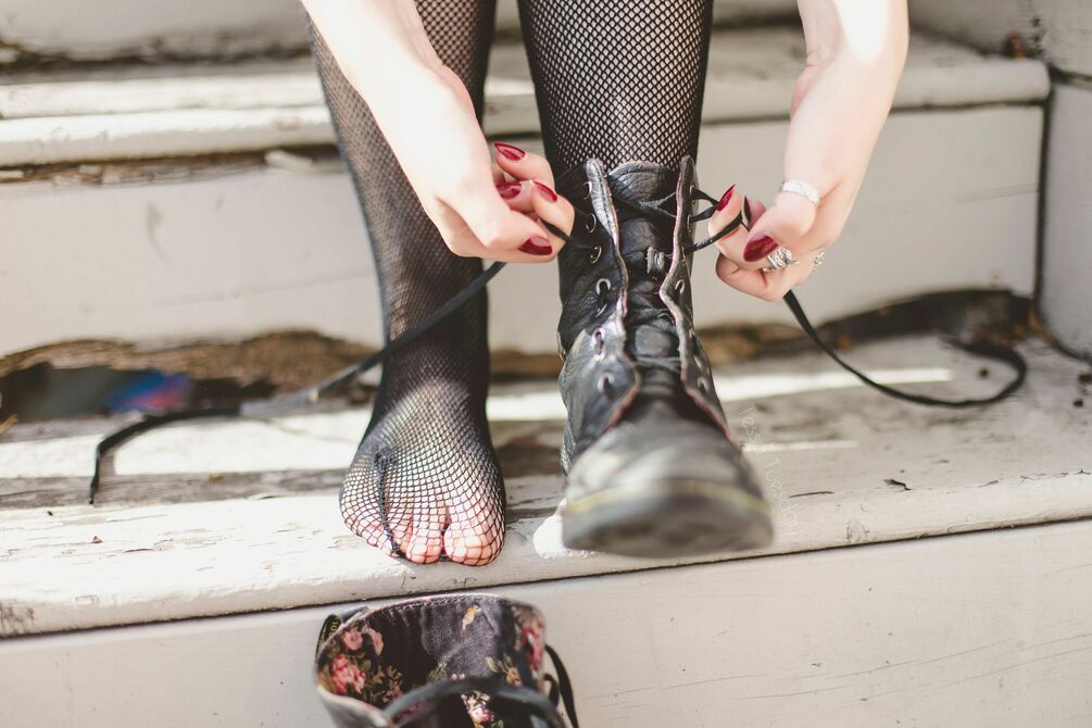 You see this punk girl at a friends barbecue and can't help but notice her well-worn boots and fishnet stockings. She sees you staring and shows you the bottoms of her boots and then, without prompting, starts to unlace them. No one's watching, but it feels risky anyway.